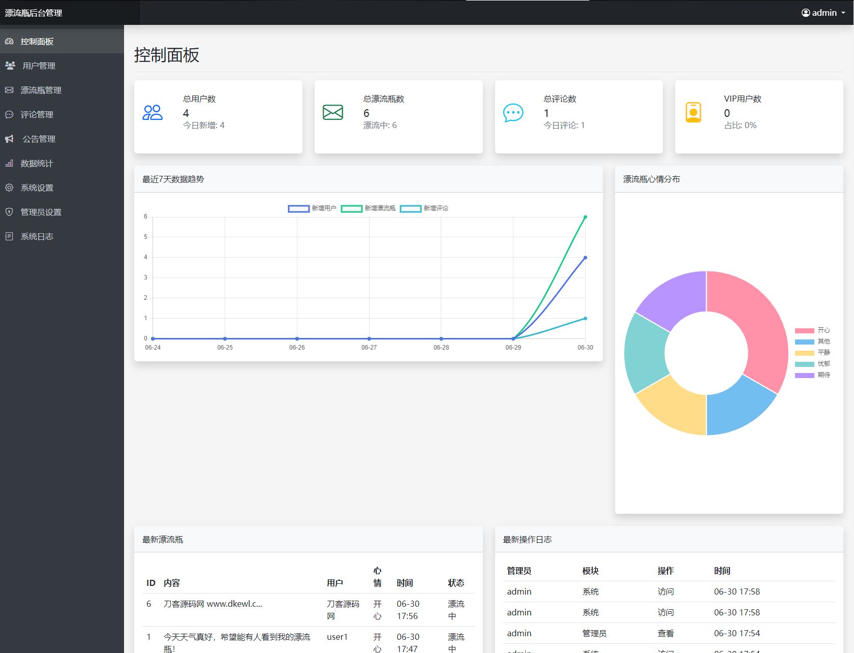 内容管理:管理漂流瓶、评论,发布公告。