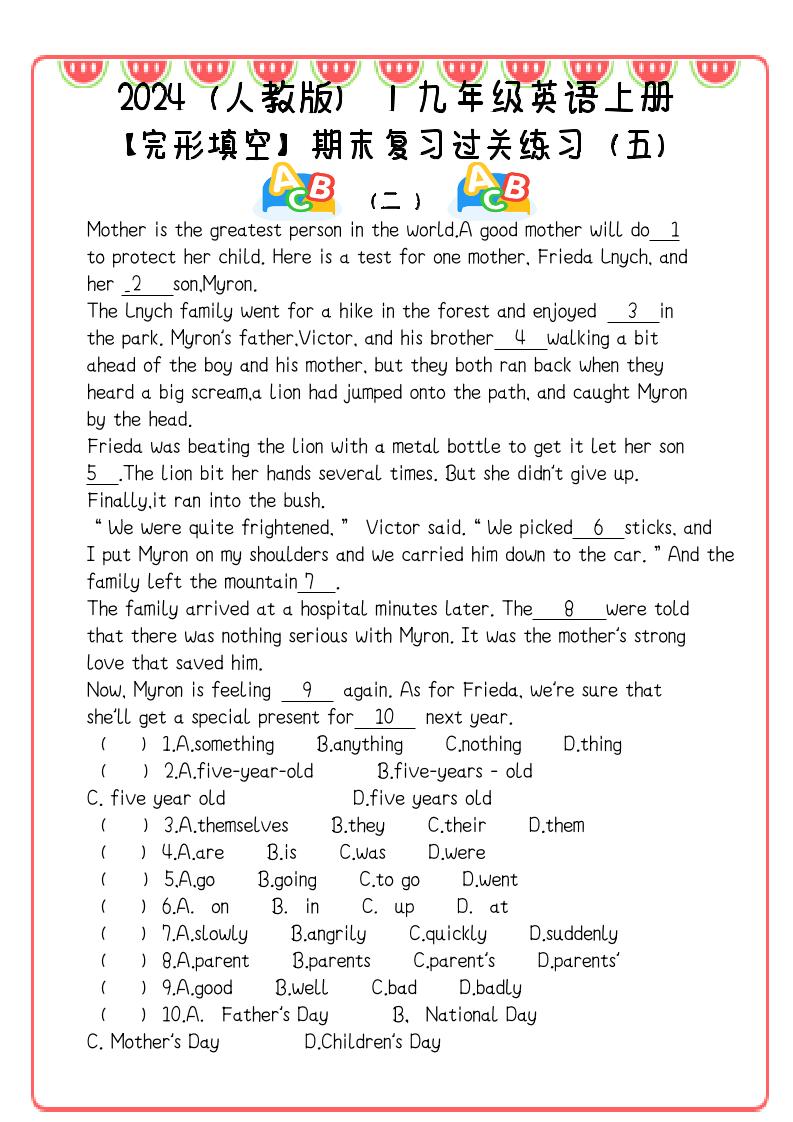 【2025秋新版】九年级英语上册:完形填空期末复习过关练习(5篇)悟思1个月前更新关注私信0110865【2025秋新版】九年级英语上册:完形填空期末复习过关练习(5篇)此内容为付费阅读,请付费后查看¥5年会员免费永久会员免费立即购买您当前未登录!建议登陆后购买,可保存购买订单付费阅读已售 5 ——预览已结束,还剩9页未读——您已获得此文档下载权限,请点击底部下载完整文档 课程下载: 此处内容已隐藏,请付费后查看 © 版权声明课程皆来自互联网,请分辨真假,保护好口袋,主要是让大家学学互联网上老司机的搞钱思路,大家一起发财!THE END九年级 喜欢就支持一下吧点赞65 分享QQ空间微博QQ好友海报分享复制链接收藏
