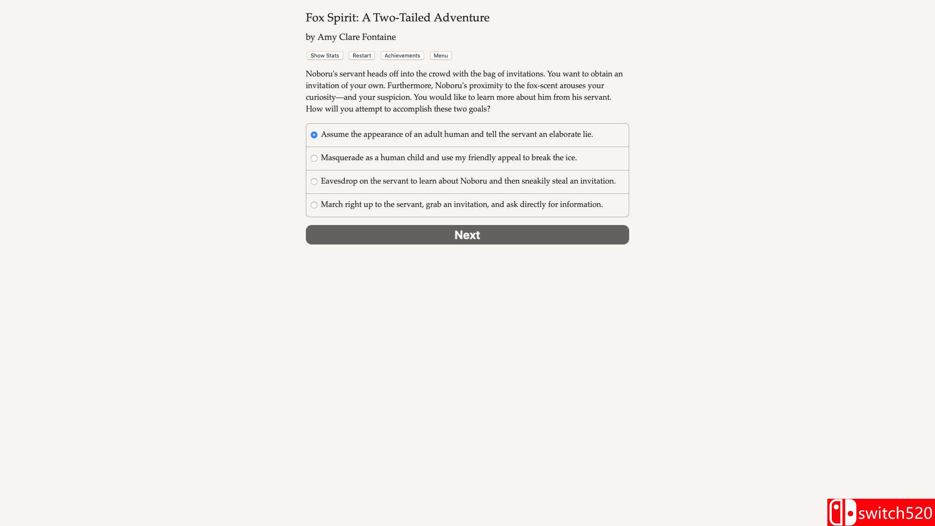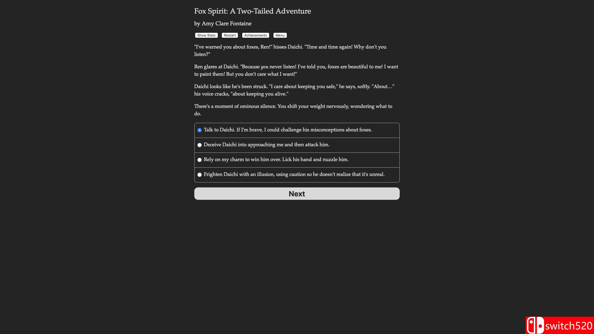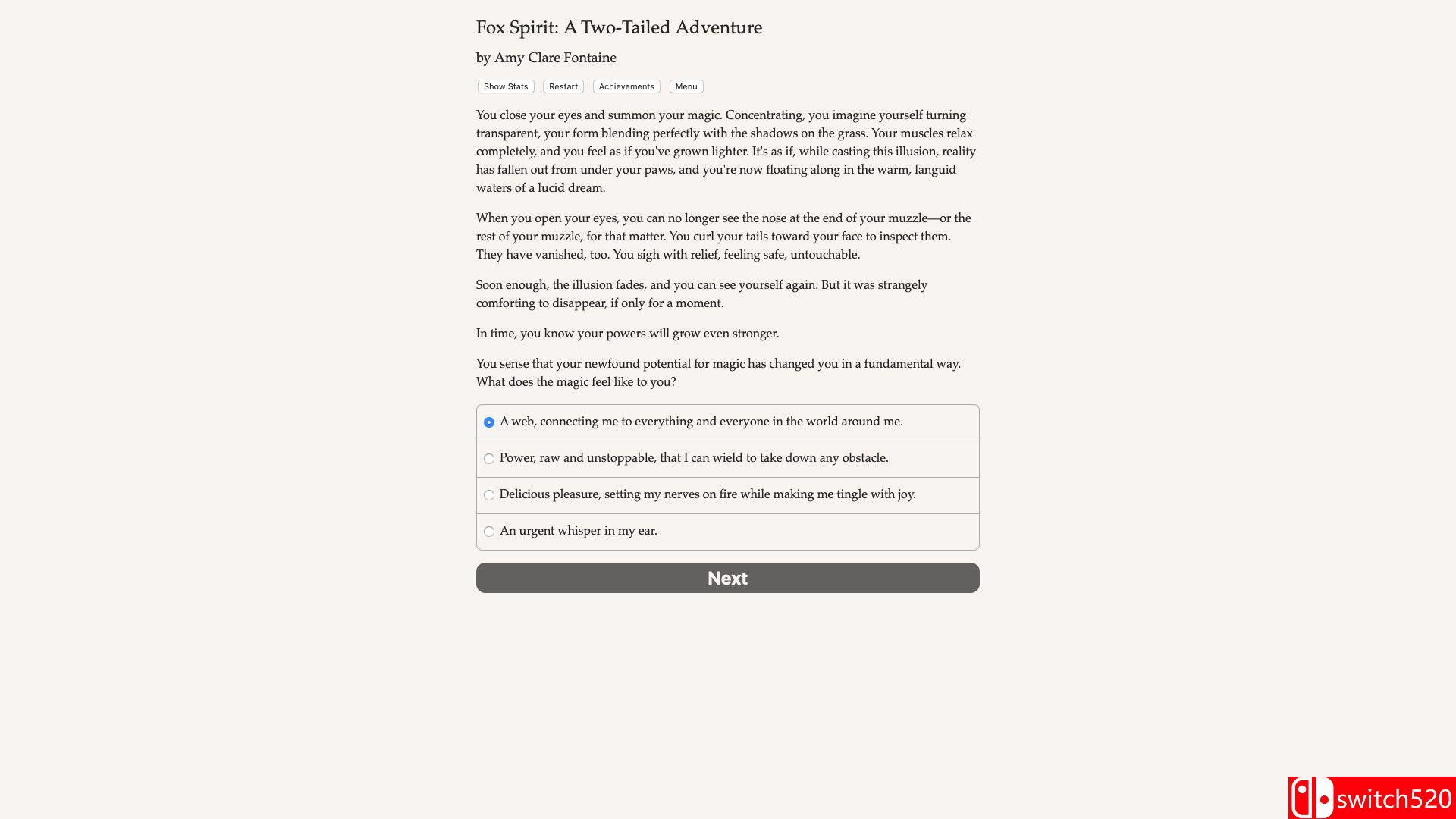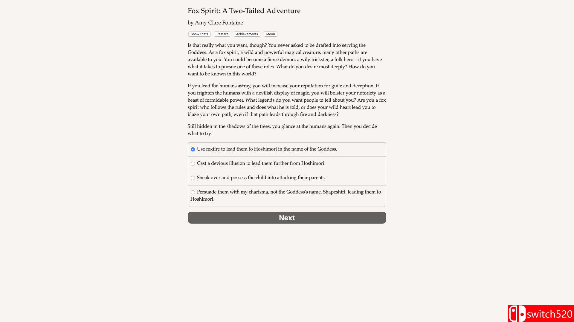 《狐灵:双尾历险记》是一款冒险解密类(AVG)游戏,《狐灵:双尾历险记》是一部由 Amy Clare Fontaine 创作、字数达 25 万字的交互式奇幻小说。游戏采用纯文本形式,完全依靠玩家的想象力驱动。你将化身为一只拥有魔力的双尾狐狸,潜入杀害你家人的仇人所在的村庄——星守村(Hoshimori),寻找传说中能赋予永生的“星珠”。在这个过程中,你可以编织幻象、变换形态,甚至操控人心。是成为仁慈的守护者、爱恶作剧的捣蛋鬼,还是凶猛残暴的恶魔?你的每一个选择都将决定你在这个世界留下的足迹。switch520