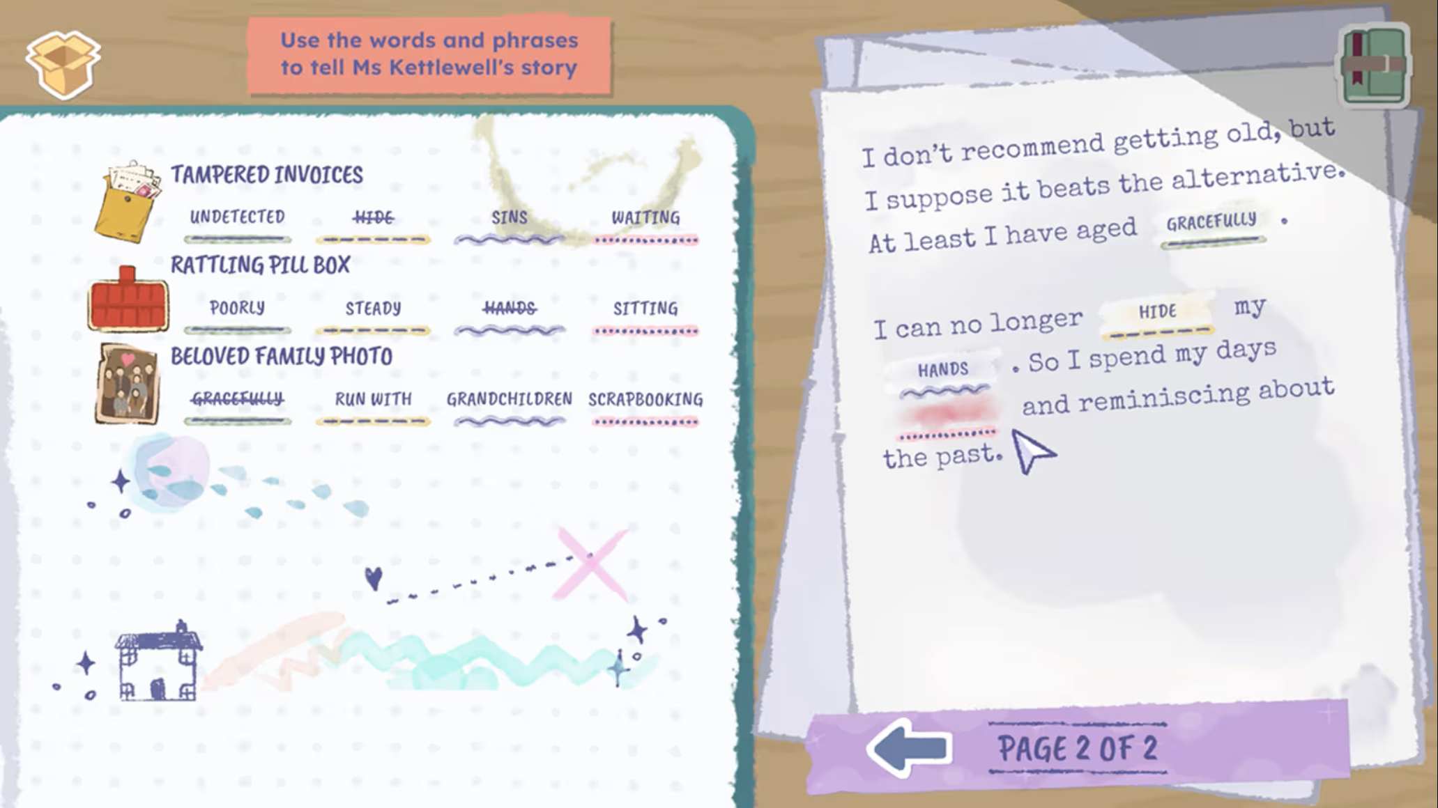Tabitha的回忆录因水渍严重损坏,关键内容缺失。你通过保留特定物品获得线索词,以“填词”方式补全句子,揭开她未曾言说的往事。你的选择决定了她将被如何铭记——是温暖慈祥的长者,还是神秘叛逆的冒险家?故事拥有温馨、滑稽、震撼、忧伤等多种可能结局。