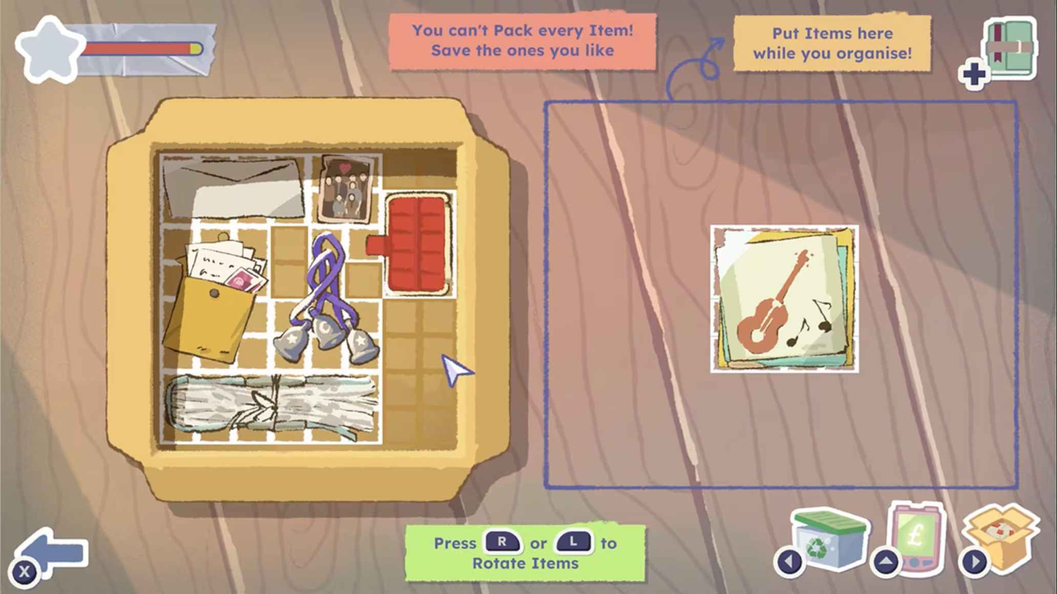 每个房间仅提供一个打包箱,容量与重量有限。你需要旋转、堆叠物品,合理利用胶带加固、真空压缩袋等工具,最大化利用空间。若追求特定故事线,需确保相关物品能同时装入箱中,否则将错失关键叙事线索。