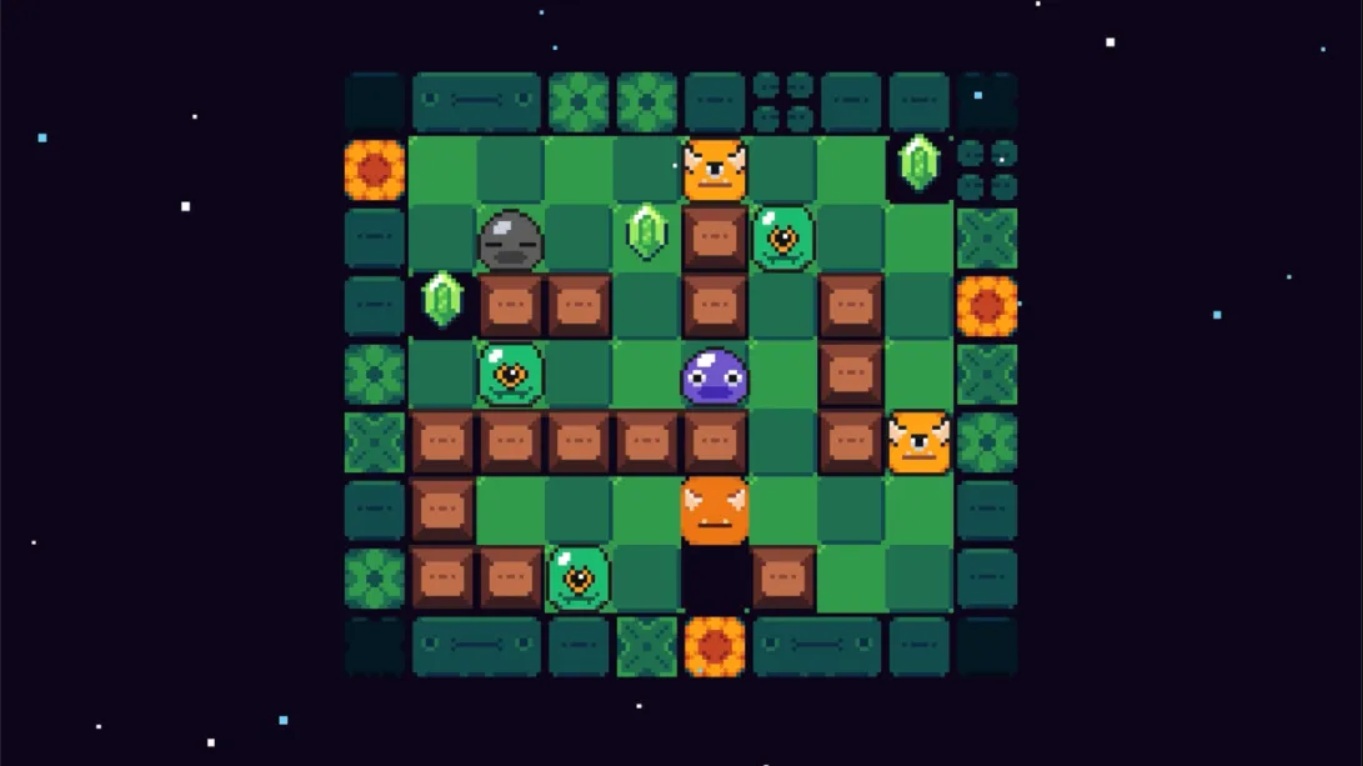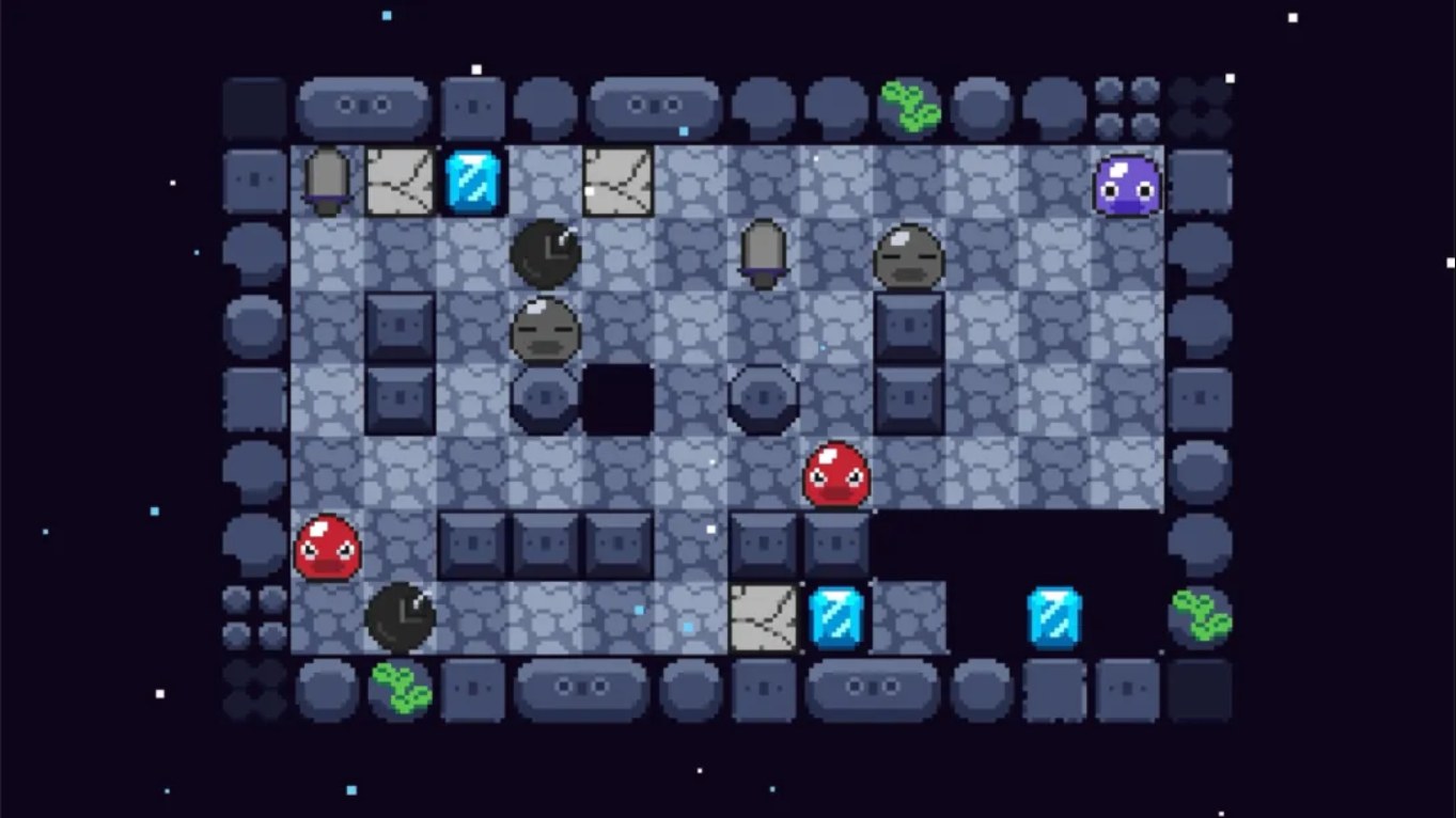 推箱子式解谜:游戏采用经典的回合制移动机制,玩家需在有限步数内规划路径,推动史莱姆伙伴或宝石到指定位置,考验空间思维与逻辑推理能力。